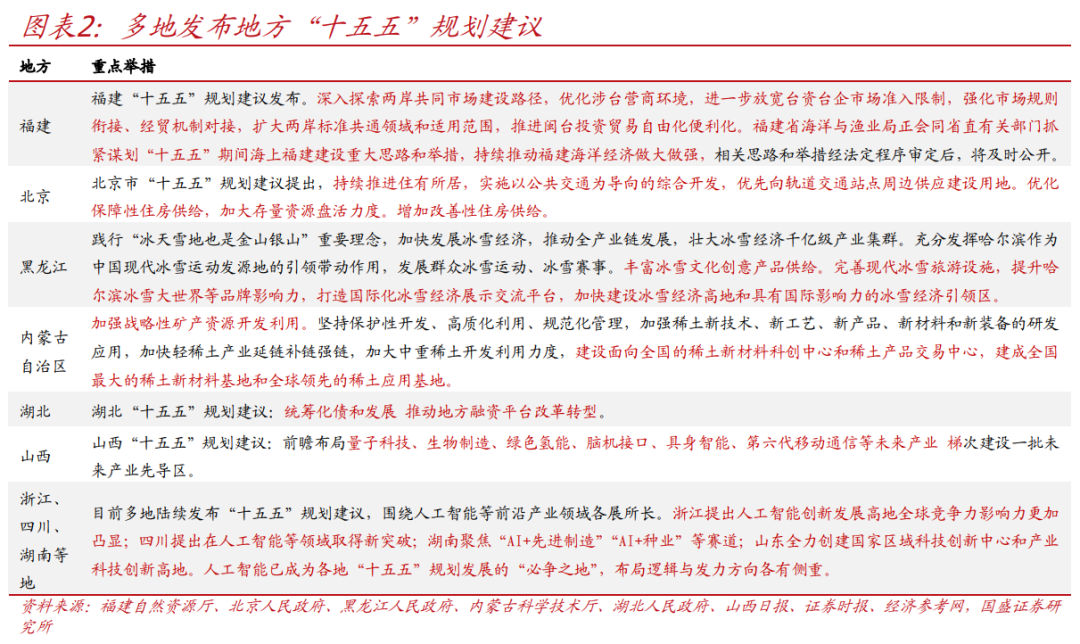 近期多地发布地方“十五五”规划编制建议稿,科技、产业仍是核心,也多因地制宜发展重点产业。近期已有超15地发布地方“十五五”规划编制建议,浙江、四川等地多围绕人工智能等前沿产业领域各展所长,重点关注各地因地制宜“划重点”,包括福建重点发展海洋经济、黑龙江发展冰雪经济(冰雪运动、赛事等)、内蒙古加大中重稀土开发(建设面向全国的稀土新材料科创中心和稀土产品交易中心)等。