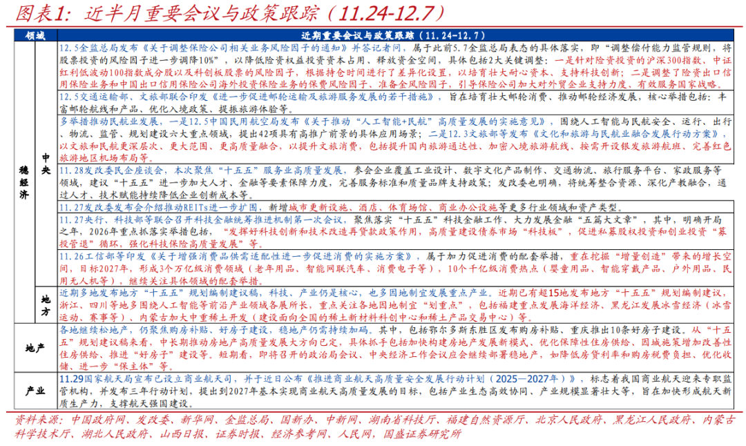 我们定期对每半月重大政策进行跟踪:1)中央、部委重要会议与政策;2)地方政策;3)行业与产业政策。本期为近半月(2025.11.24-12.7)综述。