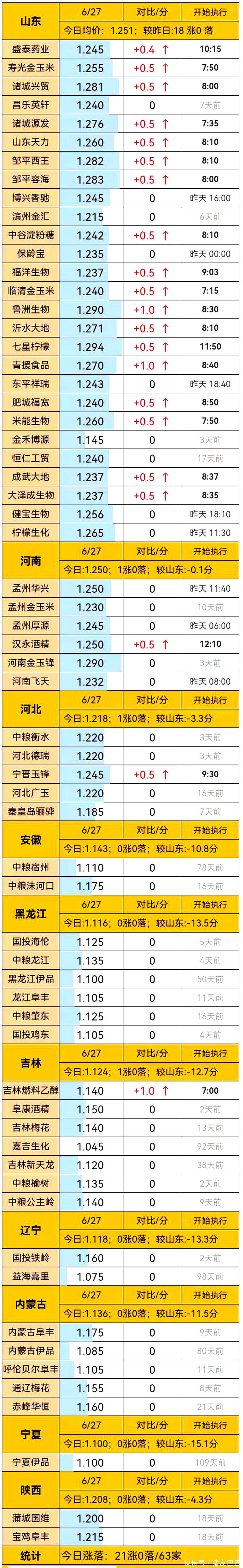 其中,在山东地区,本地大部工厂报价上涨0.5-1分/斤,山东地区玉米挂牌均价在1.251元/斤,多达18家企业上涨,主流报价涨至1.215~1.294元/斤!